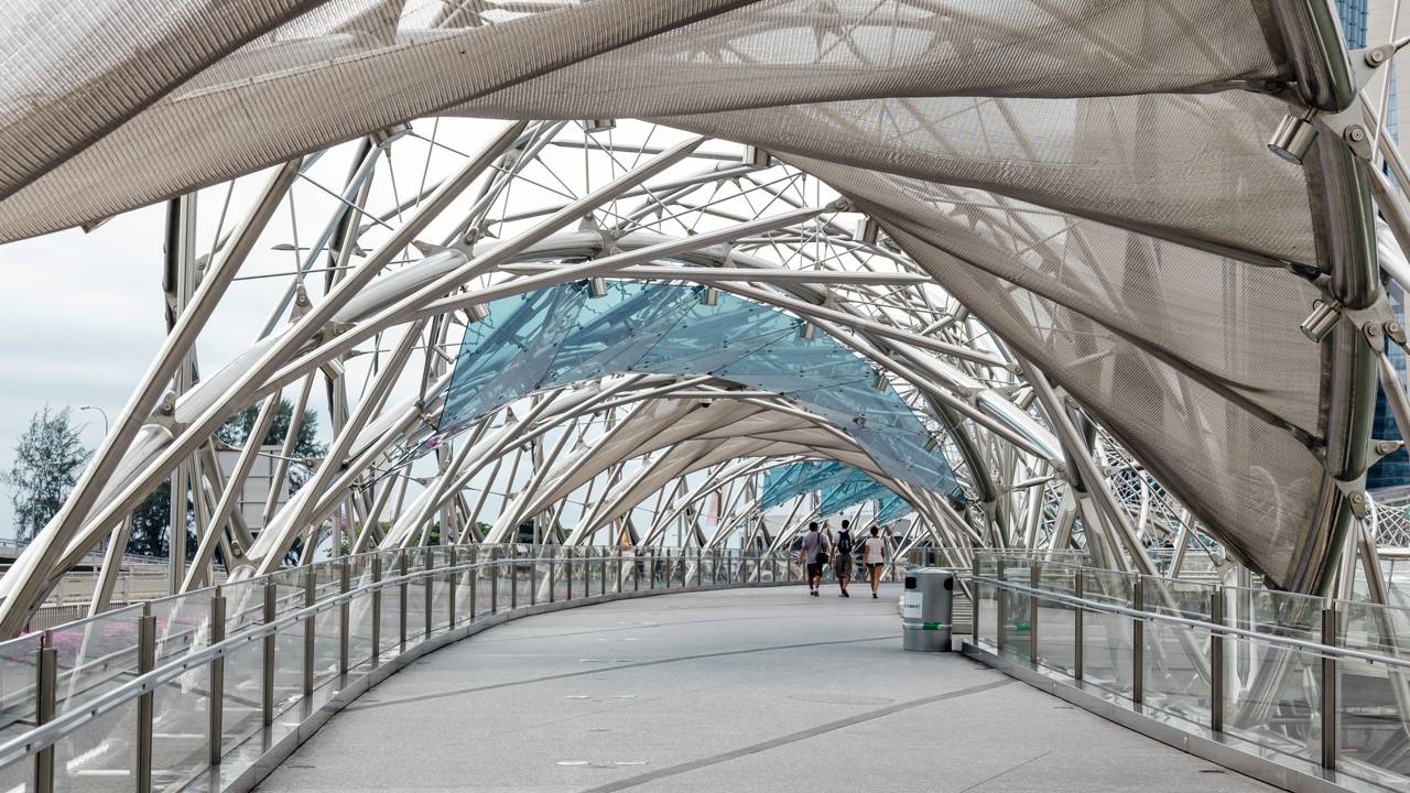 A fama da Helix Bridge deve-se à sua estrutura complexa de aço inoxidável, composta por duas espirais que se entrelaçam harmoniosamente. O projeto foi concebido para simbolizar a vida, a renovação e a continuidade, integrando engenharia de ponta ao urbanismo.