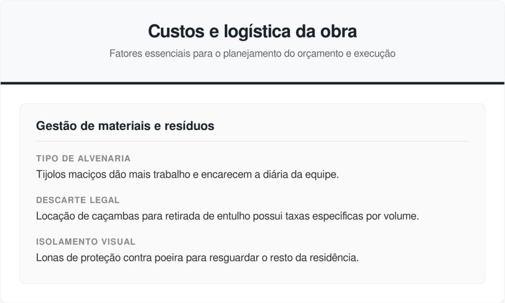 Derrubar paredes parece uma tarefa simples, mas o preço cobrado varia bastante conforme o tipo de material encontrado. Paredes feitas com bloco estrutural exigem um planejamento muito mais rigoroso e lento do que divisórias finas de gesso acartonado.