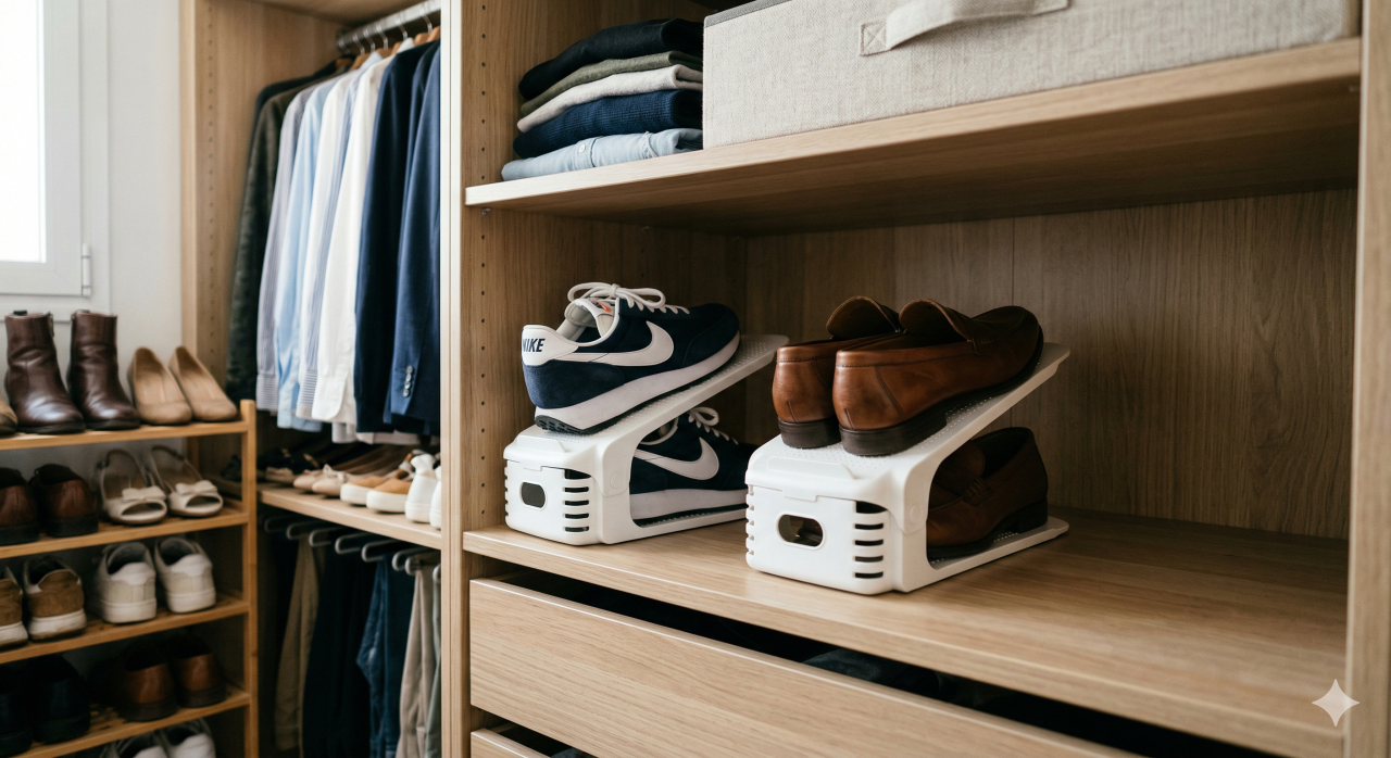 O organizador de sapatos empilhável permite que você guarde dois calçados no espaço de apenas um dentro do armário. Essa solução prática e barata evita que os pares fiquem jogados ou amassados, garantindo organização imediata com baixo investimento.