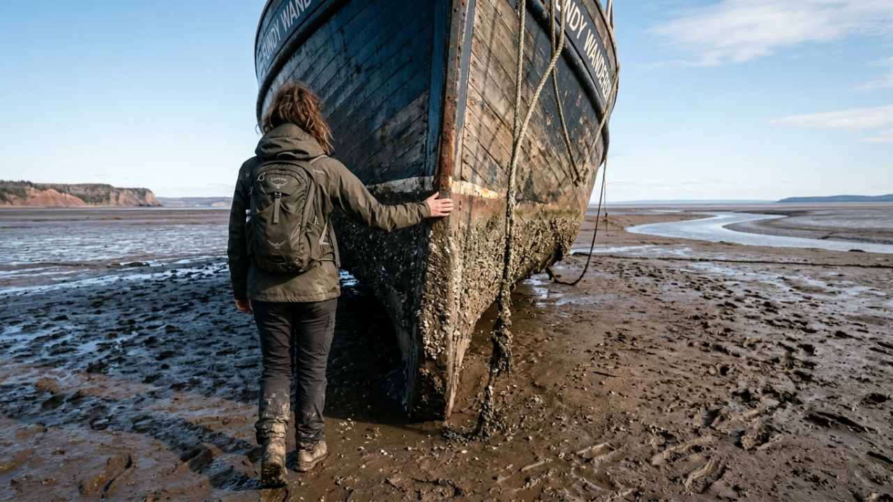 A maré da Baía de Fundy atinge a marca de 16 metros de altura em poucas horas na pequena vila de Alma. Esse fenômeno oceânico extremo faz com que barcos de pesca fiquem totalmente apoiados no solo seco diariamente.
