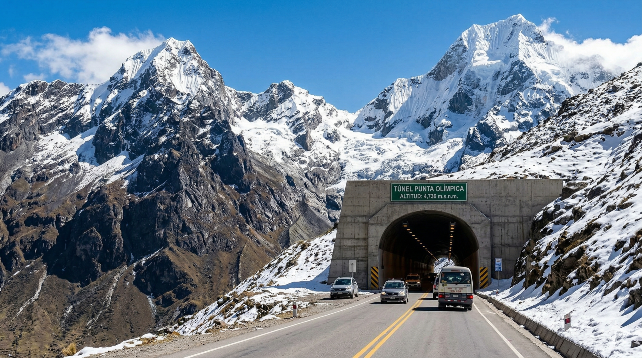 O Túnel de Punta Olímpica é um verdadeiro gigante da engenharia que corta a Cordilheira Branca no Peru, ligando as regiões de Carhuaz e Chacas em meio a cenários surreais. Essa obra impressionante permite que viajantes atravessem montanhas geladas a uma altitude que beira os 4.800 metros, garantindo o título de passagem pavimentada mais alta do planeta.