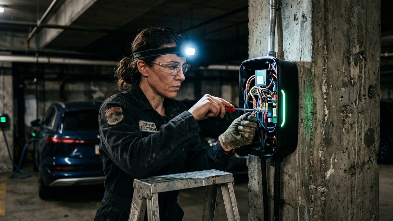 O técnico aperta o último parafuso do borne enquanto o cheiro metálico do cobre novo se mistura ao ar úmido do terceiro subsolo. Ele observa o LED verde pulsar no carregador fixado à coluna de concreto, confirmando que a energia flui silenciosamente para o SUV estacionado a poucos centímetros de distância.