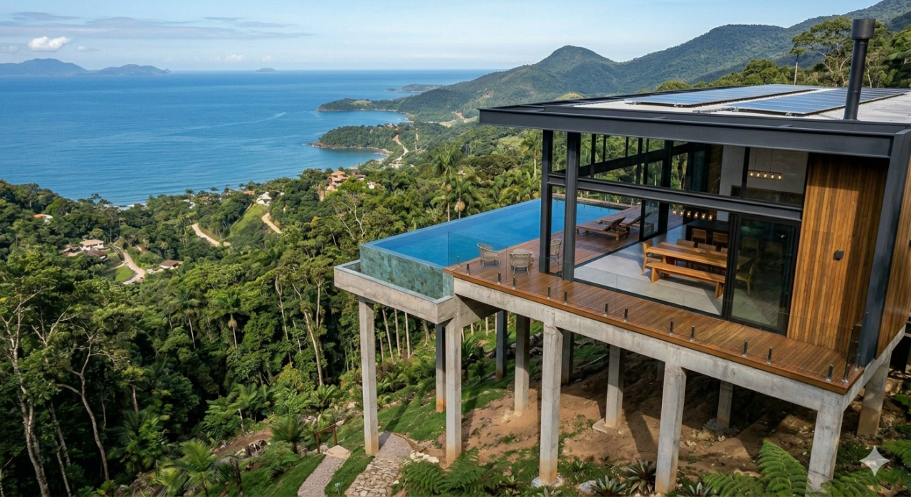 A fundação para esse tipo de residência costuma usar estacas profundas que dão estabilidade total ao imóvel. É um trabalho de engenharia civil preciso, onde o peso da casa é distribuído nos pontos de apoio sem sobrecarregar a encosta.