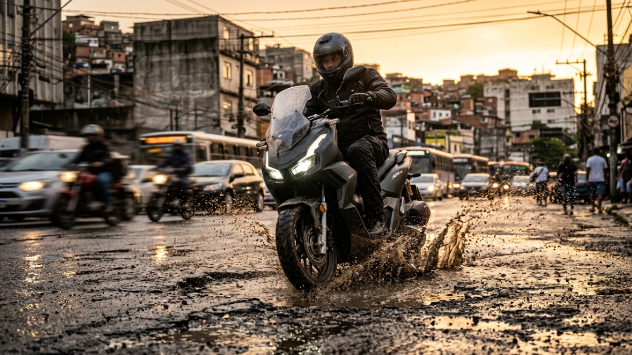 A Honda ADV 160 ignora as trilhas de terra para aplicar uma engenharia de rali na selva de pedra esburacada. O paradoxo é irônico: o comprador paga um valor premium por componentes off-road severos apenas para sobreviver ao trajeto de rotina diária até o escritório sem destruir as rodas.