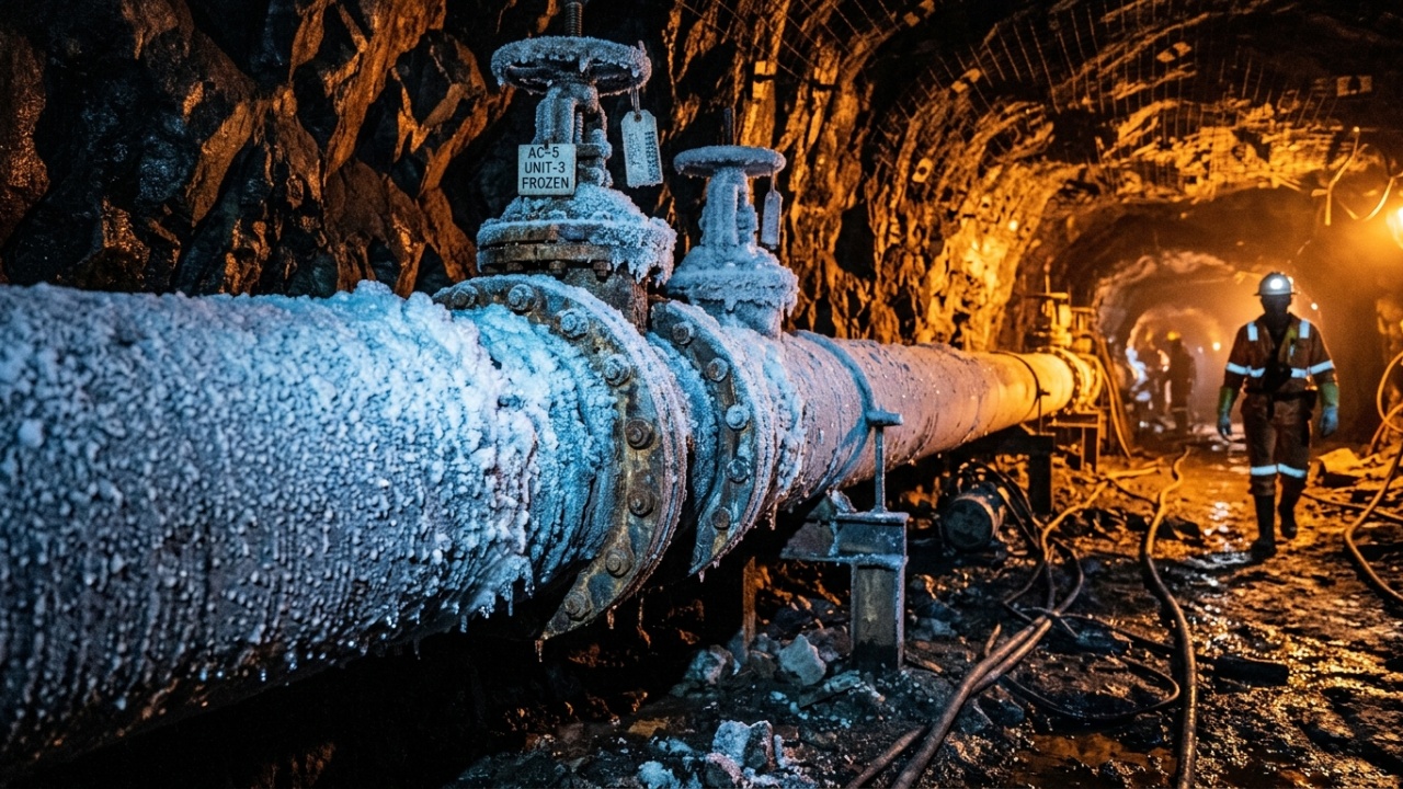 Na imensa Mina de Mponeng, na África, o termômetro atinge 60 graus contínuos nas rústicas paredes cortadas, transformando a mina mais funda num imenso forno geológico. Para impedir o cruel cozimento biológico diário de quem escava, potentes máquinas industriais bombeiam enormes toneladas de gelo líquido pelas tubulações.