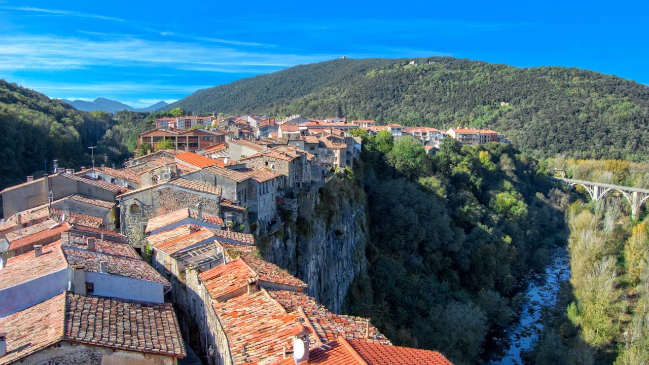 A imensa rocha basáltica onde a vila se equilibra é resultado do encontro de duas correntes de lava sobrepostas de vulcões extintos na zona vulcânica da Garrotxa. A erosão dos rios Fluvià e Toronell esculpiu as laterais durante milhares de anos, criando a crista de rocha vertical perfeitamente isolada.