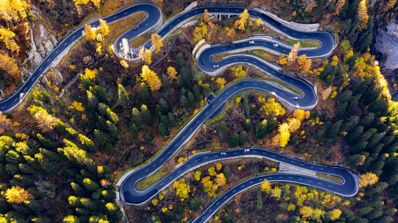 Com suas 13 curvas fechadas e atingindo 1.815 metros de altitude, a passagem de Maloja Pass na Suíça surge como um desafio épico entre vales profundos e picos glaciais. Situada no cantão dos Grisões, a rodovia conecta a elegante região de Engadina ao rústico vale italiano de Bregaglia.