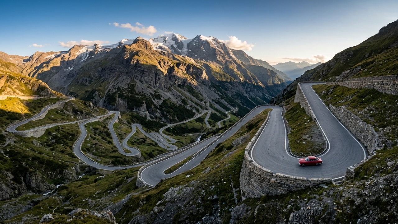 Por que o Passo dello Stelvio transforma dirigir em uma luta física? Aos 2.757 metros de altitude nos Alpes Italianos, o ar rarefeito se junta a uma sequência de 48 curvas fechadas que não dão trégua aos braços. Não é só uma estrada cênica, é um verdadeiro teste de resistência muscular para quem se aventura por seus domínios.