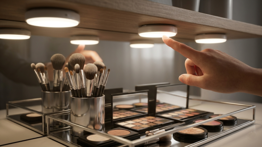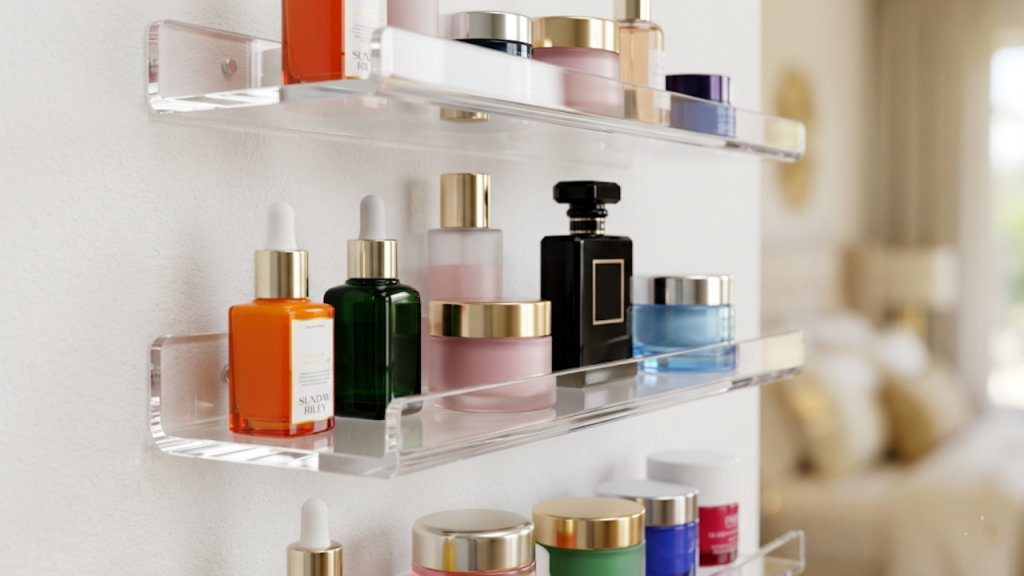 A ausência de área livre no piso exige soluções criativas para guardar cosméticos e perfumes caros. O aproveitamento da superfície ociosa mantém os frascos totalmente protegidos e facilita imensamente a rotina de cuidados diários com a pele do rosto.