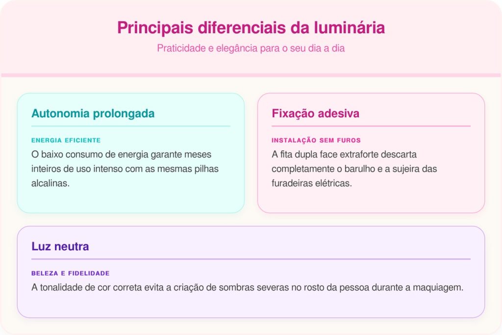 A instalação rápida de pequenos pontos de luz soluciona o problema da escuridão sem exigir quebra de paredes para puxar fiação elétrica grossa. O pacote moderno com três luminárias redondas custa em média R$ 60 e funciona perfeitamente bem.