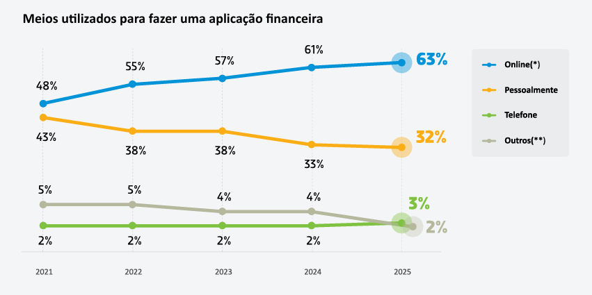 A forma como o brasileiro investe tornou-se majoritariamente digital. O uso de meios online para aplicações subiu de 49% para 63% em cinco anos. Atualmente, 46% dos investidores utilizam o aplicativo do banco para operar suas finanças.