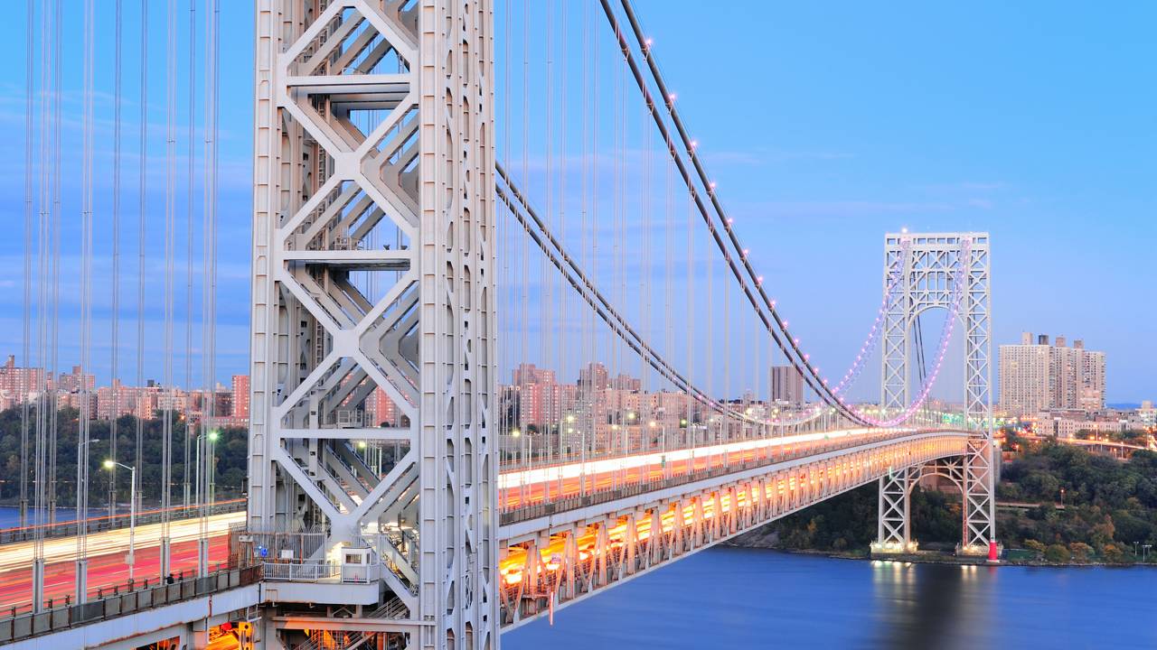 Operando 14 faixas de tráfego sobre 1.450 metros de extensão, a George Washington Bridge de Nova York, erguida em 1931, quebra recordes logísticos. Esta ponte pênsil de duplo pavimento ligando Manhattan a Nova Jersey suporta o maior fluxo de tráfego veicular do planeta.
