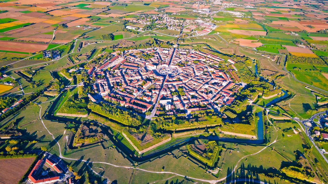 Vincenzo Scamozzi, o arquiteto por trás do conceito, idealizou a cidade para ser autossuficiente e impenetrável. Segundo a UNESCO, que a declarou Patrimônio da Humanidade, a estrutura é o exemplo máximo de arquitetura militar veneziana do século XVI.