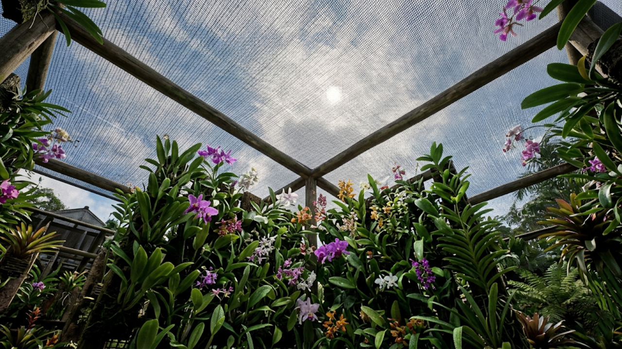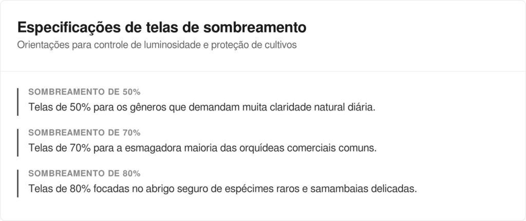 A incidência severa dos raios ultravioleta causa danos estéticos e queimaduras irreversíveis nas folhas dessas plantas epífitas. A malha sintética agrícola funciona como um escudo térmico, quebrando a energia do sol e fragmentando a força agressiva das gotas de chuvas torrenciais.