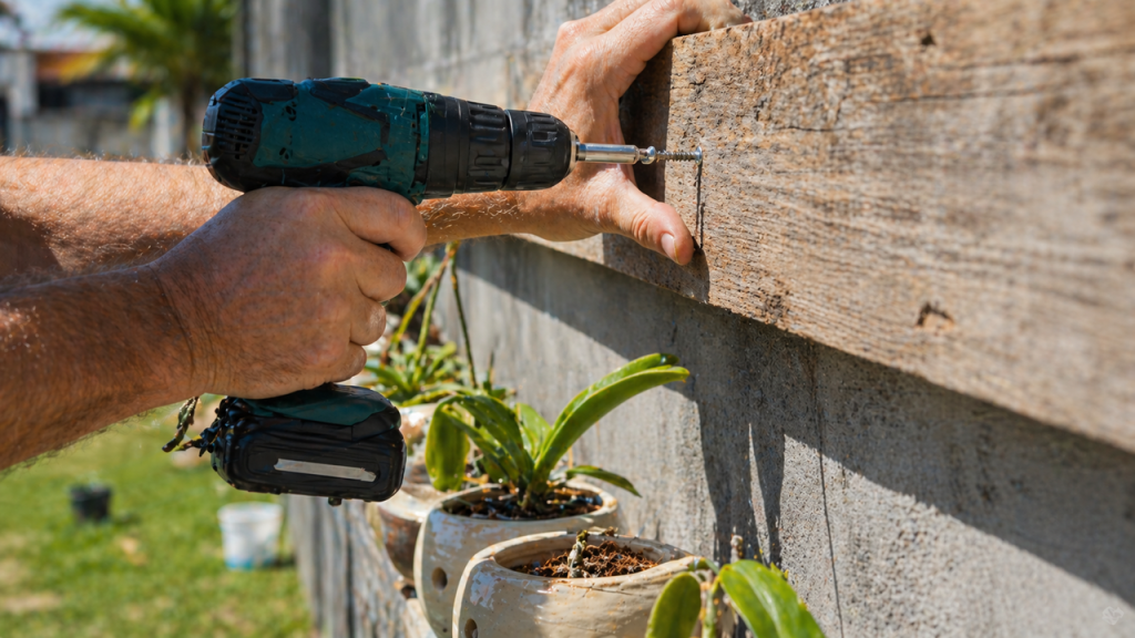 A estrutura de fixação principal precisa suportar o peso elevado dos vasos de cerâmica molhados sem ceder estruturalmente com o passar do tempo. A madeira de demolição oferece altíssima resistência contra cupins e umidade, custando entre R$ 80 e R$ 150 por metro quadrado.