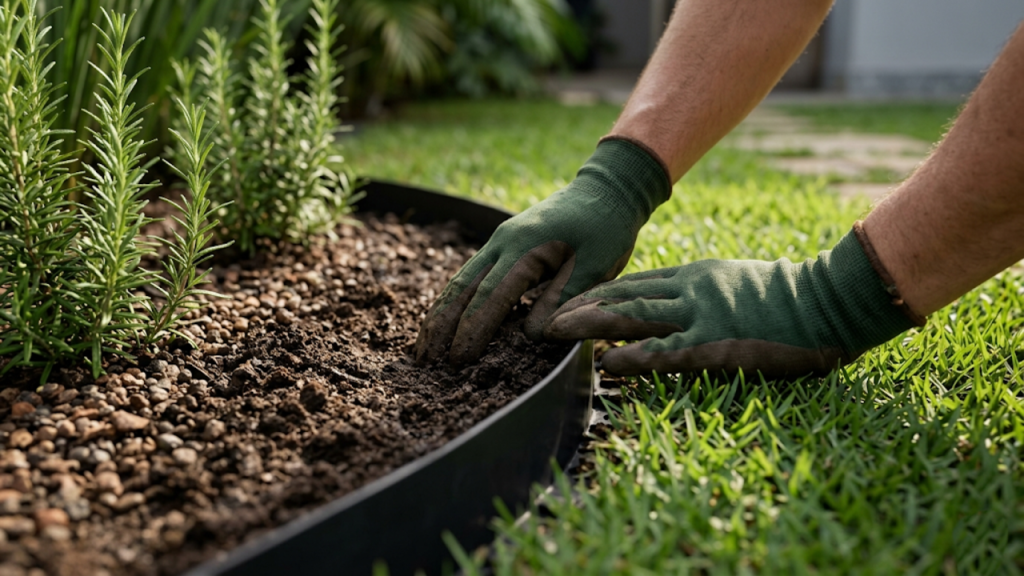 Esse cuidado delimita perfeitamente as áreas de terra livre e assegura que a água da rega penetre exatamente onde precisa. Com essa divisão bem demarcada, a rotina de limpeza e o desenho do canteiro permanecem imaculados por muitos anos seguidos.