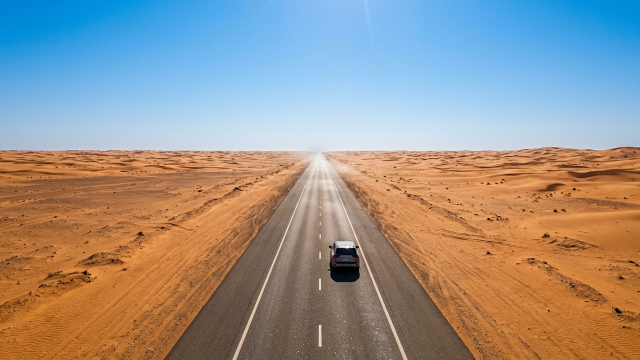 O traçado da Highway 10 atravessa o Rub’ al Khali, o chamado “Quarto Vazio”. Com 650.000 km², é o maior deserto de areia contínua do mundo. Não há montanhas a contornar, nem vales a atravessar: apenas areia até onde a vista alcança.