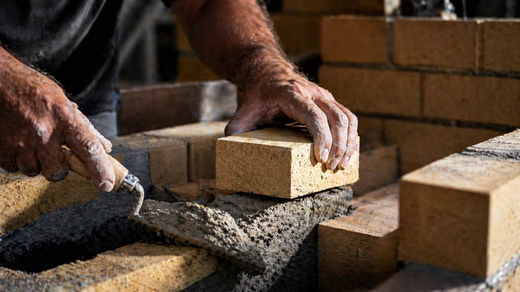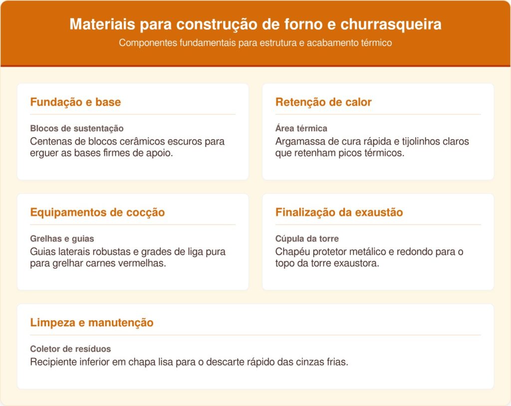 Levantar a base pesada exige a compra de produtos que suportem variações de temperatura rotineiras sem rachar. A estética rústica pede tijolos aparentes bem desenhados, sacos de areia lavada, cimento comum fresco e argamassa de assentamento extremamente firme.