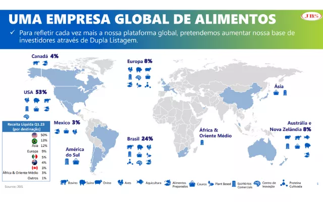 Em comunicado oficial, a gigante afirma estar tentando adequar sua estrutura societária ao perfil global e diversificado de suas operações, já globais, conforme gráfico abaixo. A dupla listagem seria para “destravar o valor das ações da companhia, ampliar sua capacidade de investimento e fortalecer sua competitividade em relação aos concorrentes globais”.