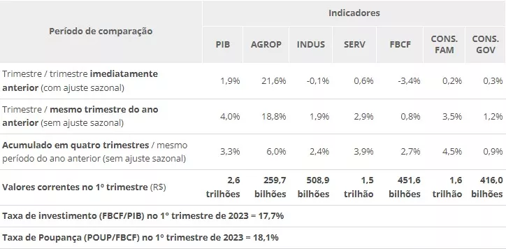 Já se comparado ao mesmo período do ano anterior, a guinada foi de 4%. Em valores correntes, o PIB totalizou R$ 2,6 trilhões nesses primeiros três meses.