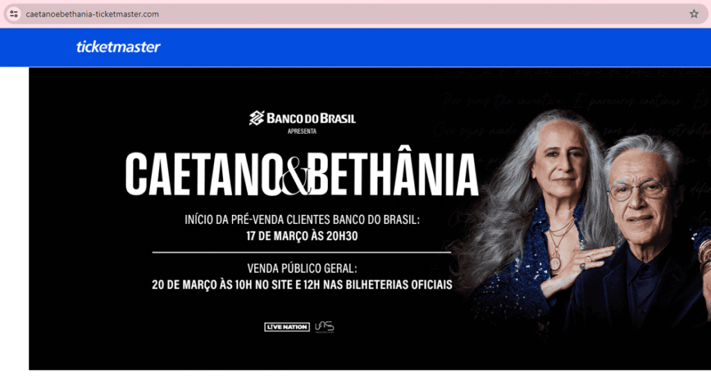 Um site está aplicando golpes vendendo falsos ingressos para o show de Caetano Veloso e Maria Bethânia, cujas vendas para o público geral começaram nesta quarta-feira (20). O site golpista aparece nos primeiros resultados de busca do Google em buscas como “ingressos Caetano e Bethânia” como conteúdo patrocinado.