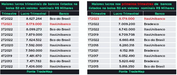 O Itaú Unibanco teve o maior lucro da história, no 1º trimestre do ano, considerando todos os bancos listados na Bolsa. Além disso, esse resultado também representa o segundo maior lucro trimestral da história dos bancos no Brasil, aponta levantamento do TradeMap.