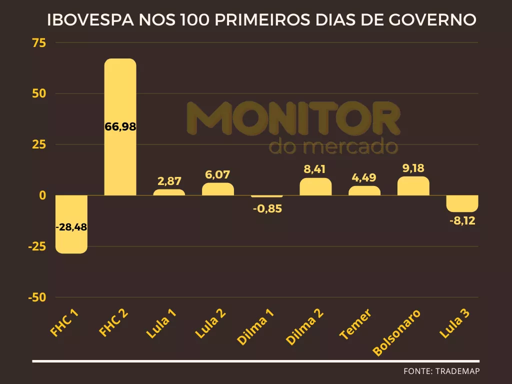 Considerando até 6 de abril, último pregão antes de completar a marca, o Ibovespa acumulava queda de praticamente 8%. Com FHC, os 100 primeiros dias viram uma baixa de mais de 28%.