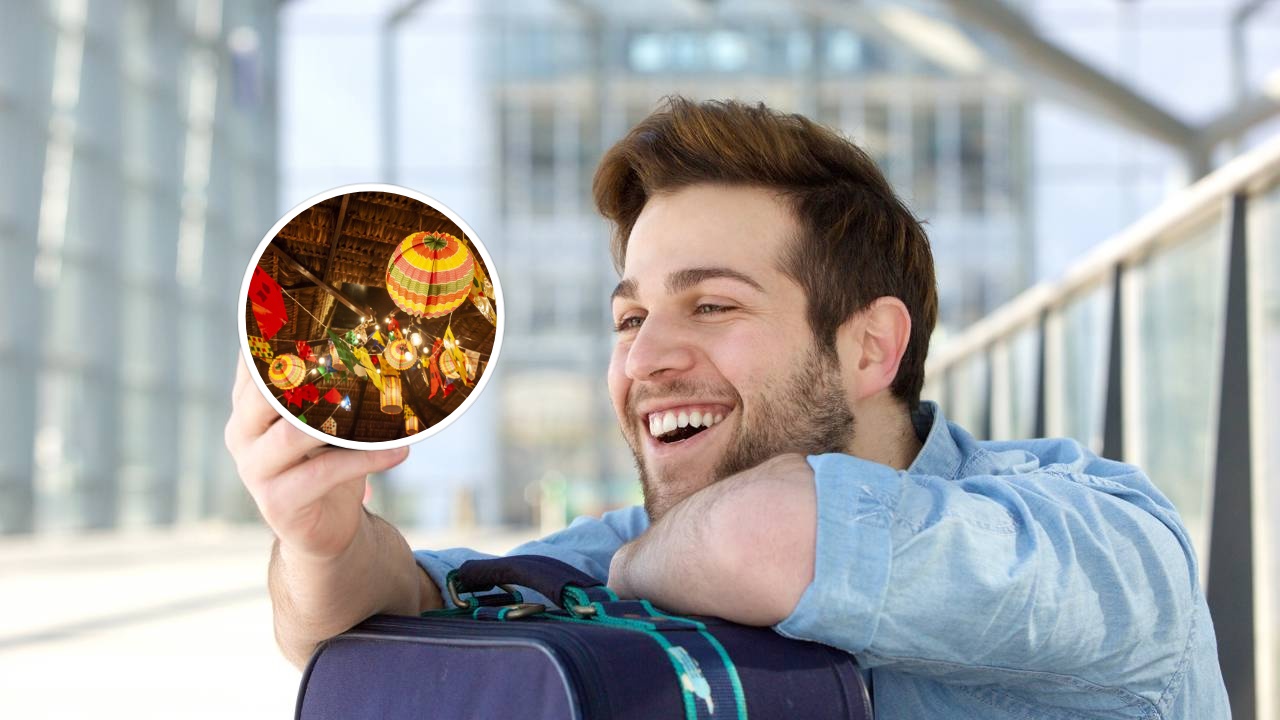 Jovem feliz com mala de viagem olhando para o celular e bandeiras e lanternas tradicionais das festas de junho no nordeste do Brasil - Créditos: depositphotos.com / contato@caciomurilo.com.br - Créditos: depositphotos.com / mimagephotos