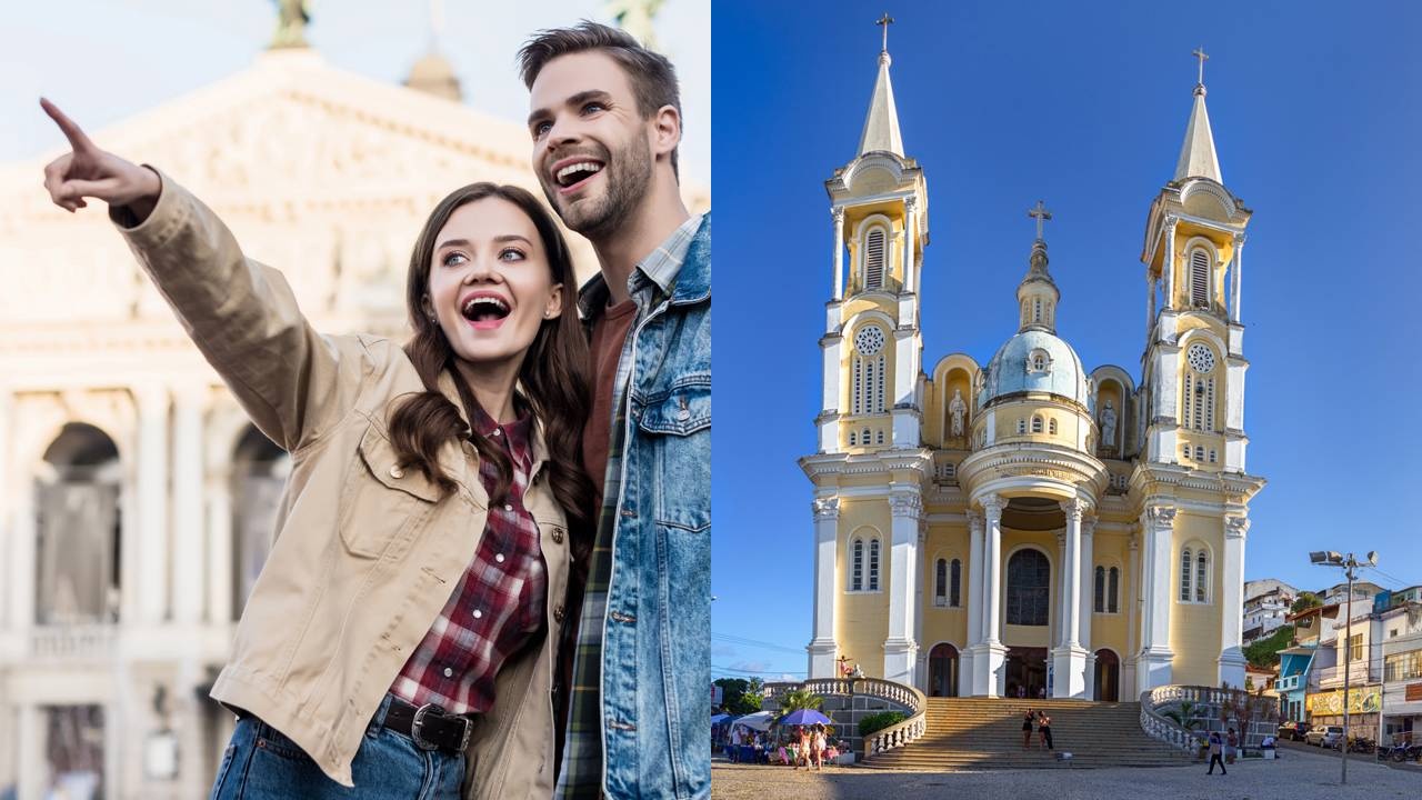 Homem com a mão no bolso sorrindo enquanto mulher animada aponta com o dedo na cidade e Catedral de São Sebastião. Ilhéus, Brasil - Créditos: depositphotos.com / ruramos - Créditos: depositphotos.com / HayDmitriy