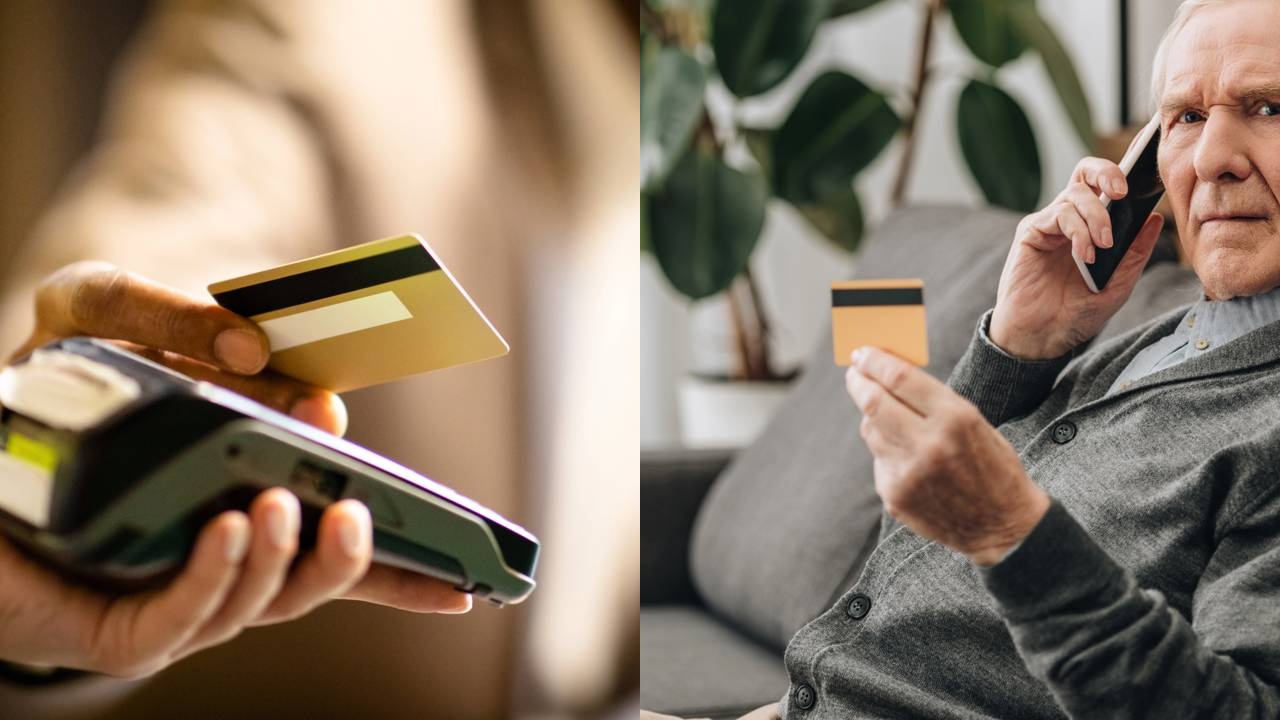 Homem idoso falando ao smartphone e segurando um cartão de crédito e Gerente negro entregando cartão de crédito para garçonete - Créditos: depositphotos.com / Milkos - Créditos: depositphotos.com / AndrewLozovyi