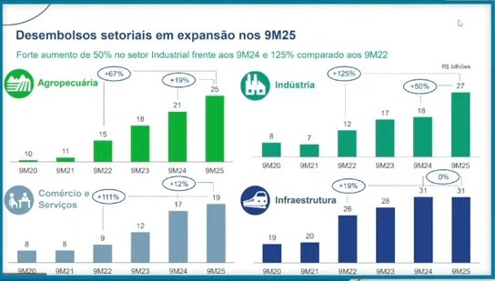 Os desembolsos do BNDES atingiram R$ 101,9 bilhões de janeiro a setembro deste ano, valor que representa uma alta nominal de 17% frente ao mesmo período de 2024, conforme dados divulgados pelo banco nesta sexta-feira (14).
