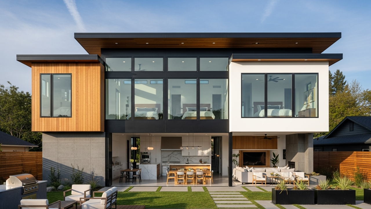 O estilo contemporâneo combina pé-direito duplo, grandes esquadrias pretas, painéis cimentícios, madeira natural e integração de ambientes internos e externos, remetendo a residências modernas europeias e casas urbanas americanas, priorizando iluminação natural, ventilação cruzada e estética limpa.