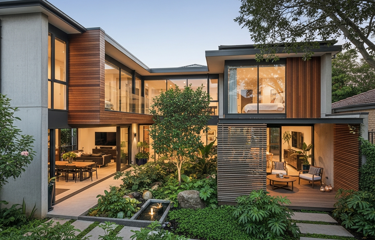 A experiência residencial transmite integração familiar, sensação de amplitude, conforto térmico e fluidez nos deslocamentos internos, promovendo convivência no jardim central e lazer seguro no pátio lateral protegido, com conexão contínua entre ambientes internos e externos.