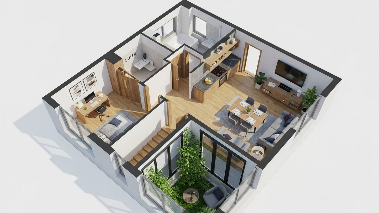 A casa térrea compacta com 1 suíte, escritório e jardim interno, projetada para terrenos urbanos reduzidos em São Paulo e Curitiba, prioriza funcionalidade, conforto térmico e iluminação natural. O jardim interno funciona como núcleo de ventilação, promovendo integração visual e bem-estar diário.