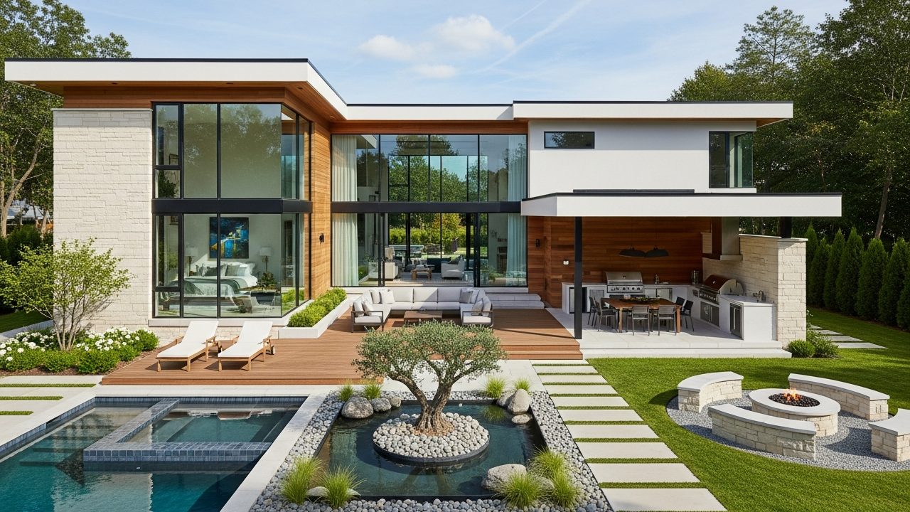 O estilo contemporâneo combina reboco claro, painéis cimentícios, madeira natural e esquadrias pretas, com amplos panos de vidro voltados ao pátio. Segundo o vídeo fornecido, essa composição cria ambientes amplos e iluminados, promovendo sensação de amplitude e funcionalidade para toda a família.