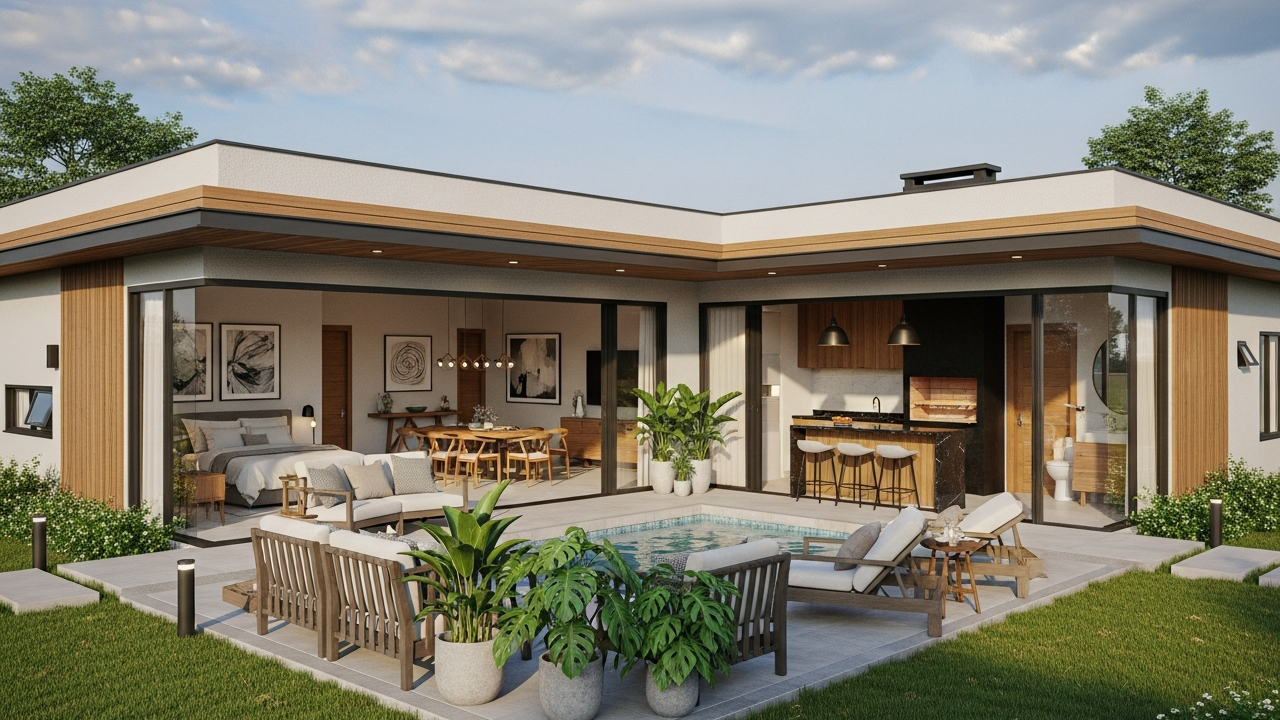 Projetada para famílias modernas que valorizam convivência e conforto, a casa térrea em U de 106 m² combina integração social e funcionalidade. Localizada em bairros planejados, como Jardim Europa e Alphaville, promove aproveitamento eficiente de luz natural e ventilação cruzada, ampliando sensação de espaço.