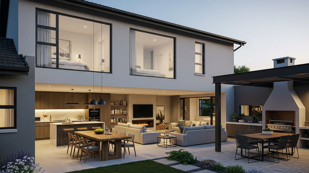 A residência possui 3 dormitórios, sendo 1 suíte, além de 2 banheiros, sala com pé-direito duplo e cozinha integrada. O quintal funcional conecta-se diretamente à área social, oferecendo espaço para lazer, refeições externas e pequenas hortas ou jardins.