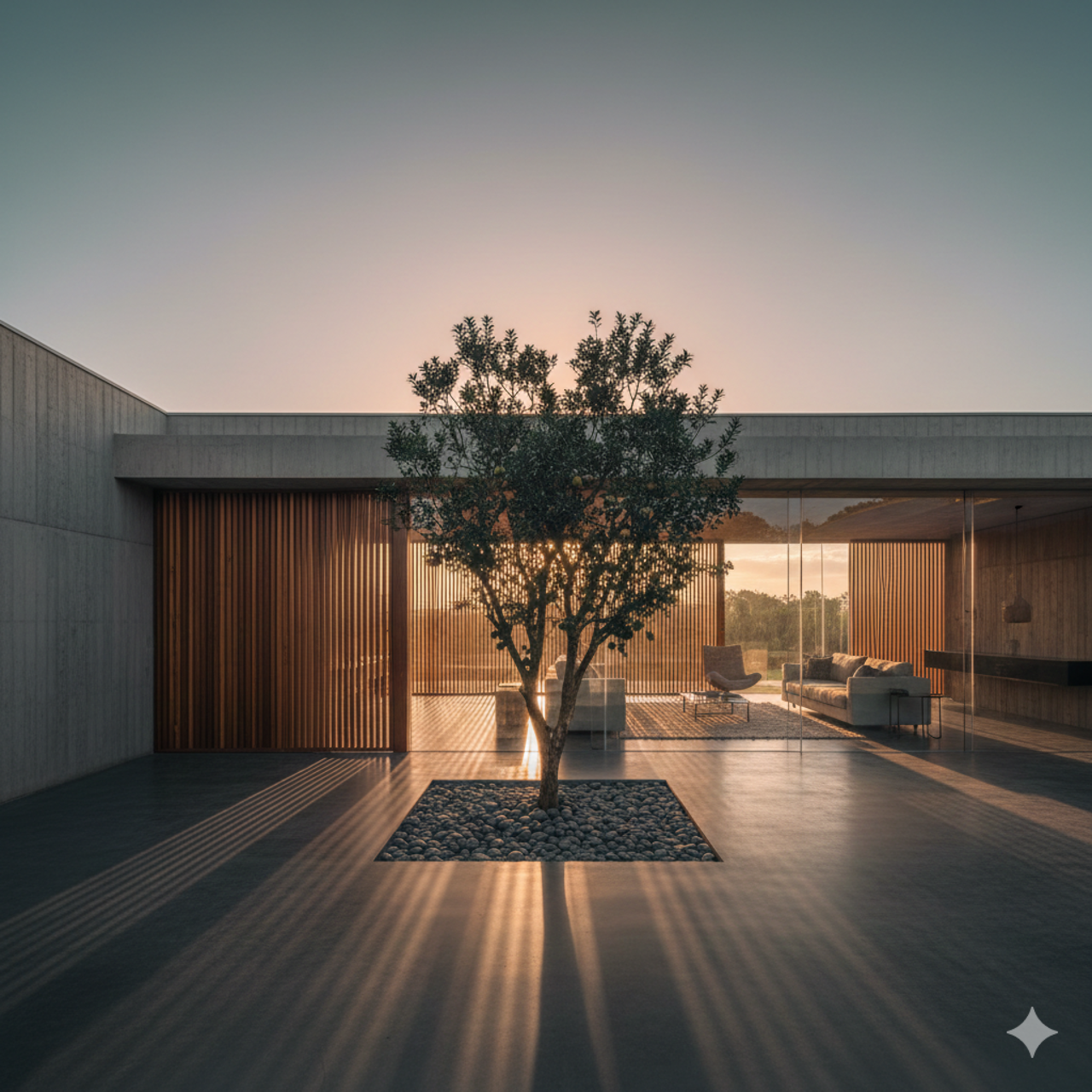 O pátio central atua como regulador ambiental, promovendo trocas térmicas naturais, reduzindo a necessidade de climatização artificial, favorecendo a entrada de luz difusa, estimulando a renovação constante do ar, melhorando o conforto interno e contribuindo diretamente para eficiência energética e sustentabilidade residencial.