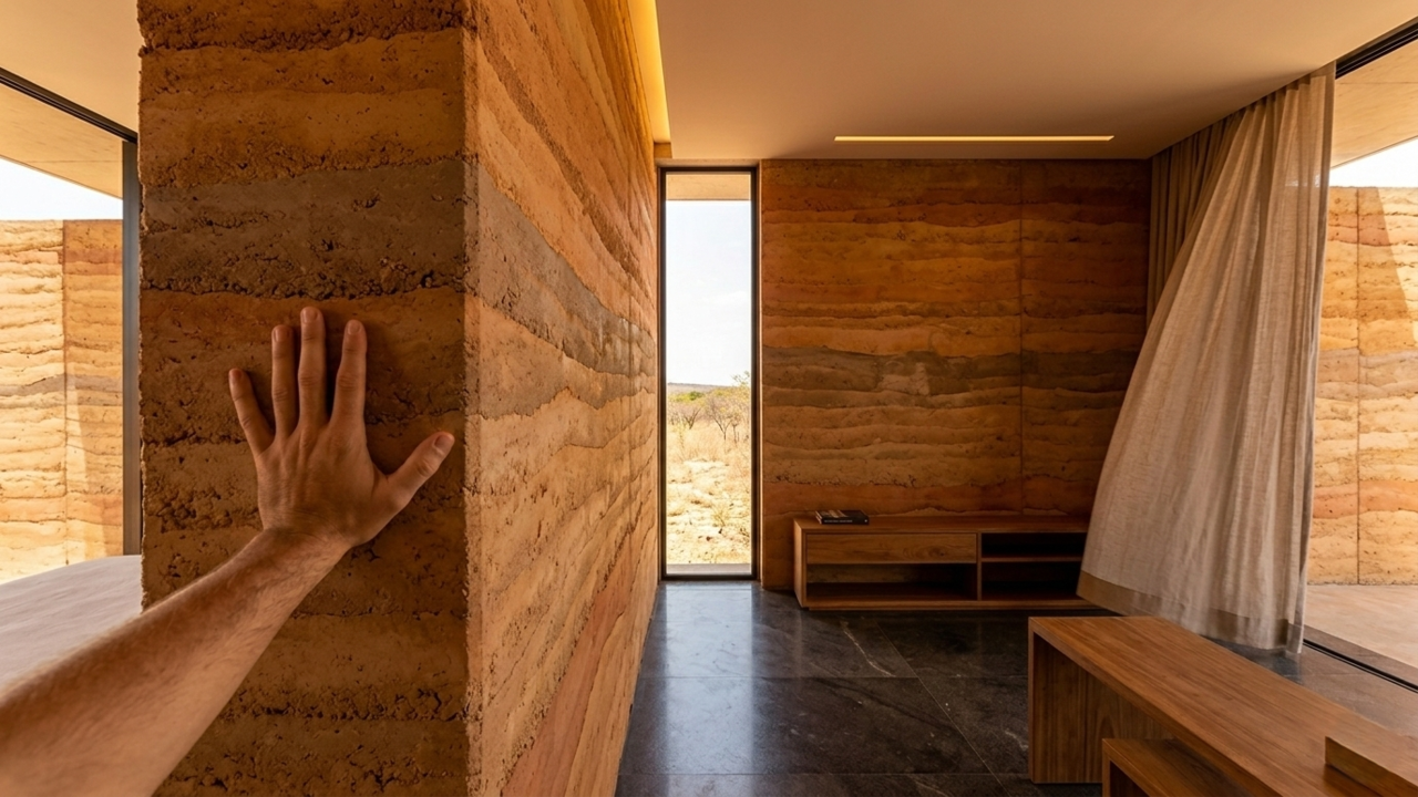 A técnica de terra compactada, ou rammed earth, consiste em comprimir camadas de solo úmido e estabilizante dentro de fôrmas rígidas até que atinjam densidade estrutural. Em um projeto arquitetônico de casa, esse processo cria paredes autoportantes que dispensam o uso de pilares convencionais, resultando em superfícies com camadas sedimentares visíveis.
