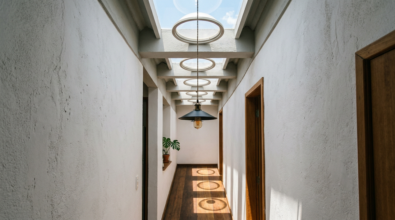 A iluminação zenital permite a entrada de luz natural por aberturas no teto, reduzindo o uso de iluminação artificial durante o dia. Quando combinada com ventilação, essa solução melhora tanto o conforto térmico quanto a eficiência energética da casa.