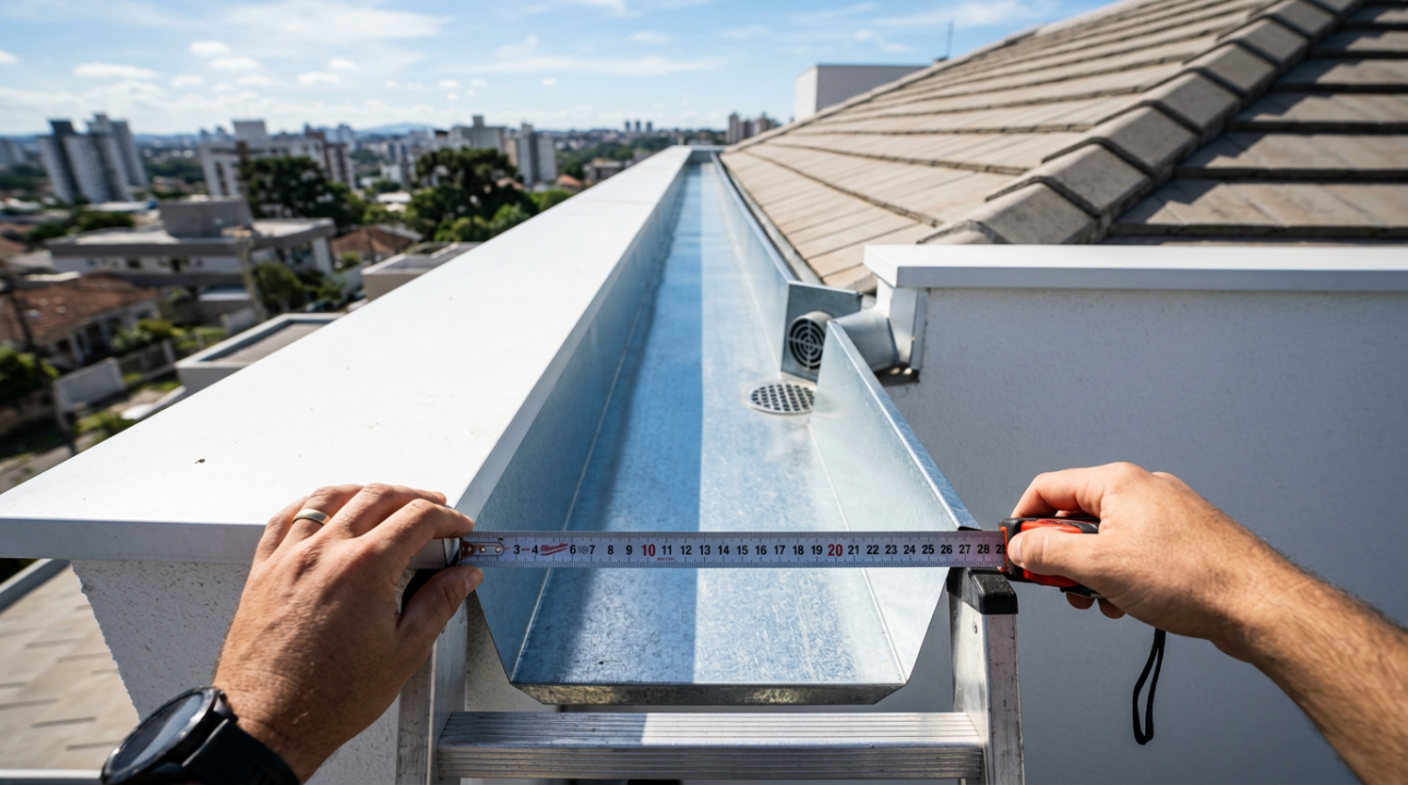 Pontos fundamentais ao planejar uma casa com calha de platibanda oculta exigem leitura correta da chuva de projeto, inclinação mínima, seção de calha, número de condutores e saída de emergência independente. A NBR 10844 trata da drenagem predial de águas pluviais e adota critérios como intensidade pluviométrica, duração e período de retorno para o cálculo de vazão. Em telhados não aparentes, a segurança hidráulica depende de folga operacional e manutenção prevista desde o desenho.