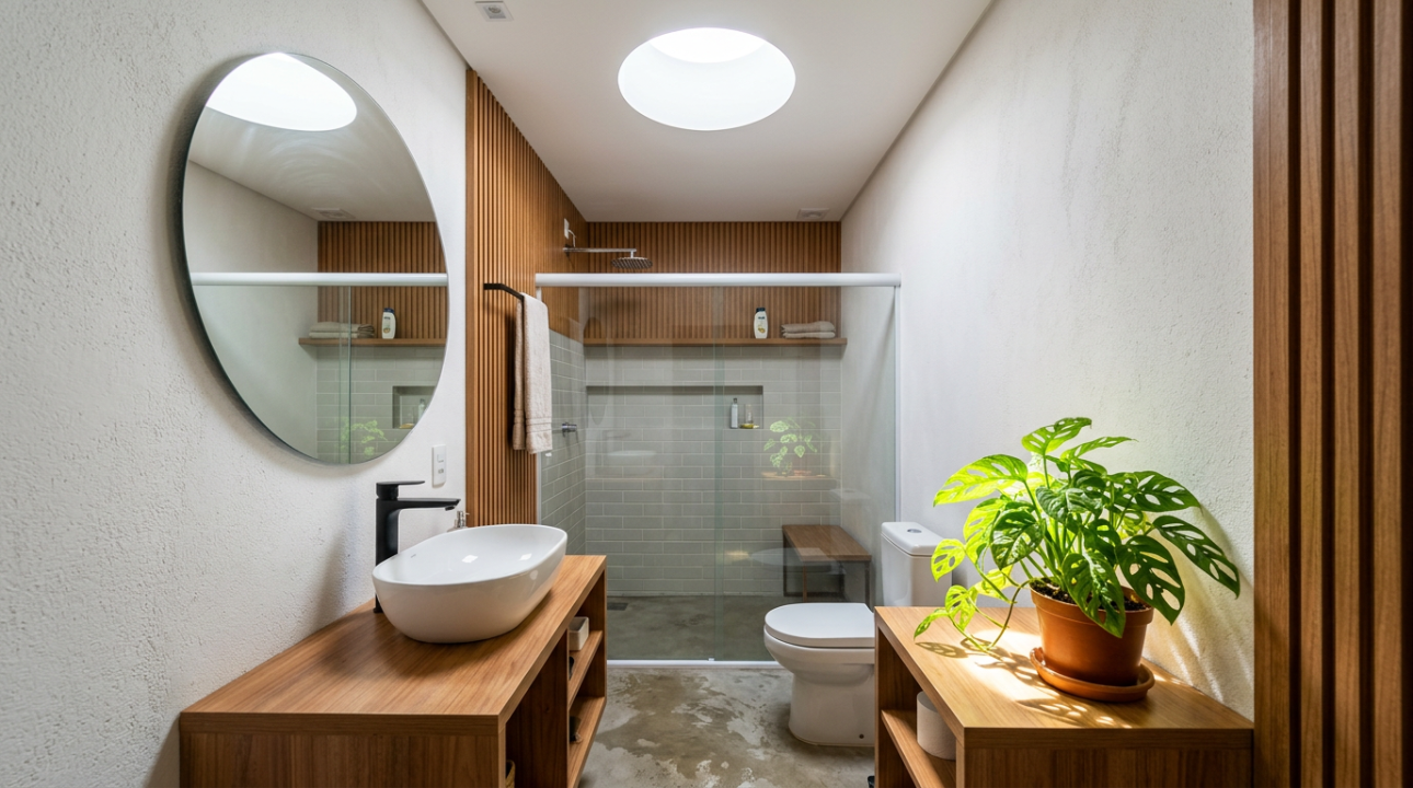 - Controle da carga térmica: O principal benefício é que o sistema não transmite o calor solar para o ambiente interno, o que é essencial para manter a temperatura agradável em ambientes compactos, como banheiros centrais em casas de 48 m².