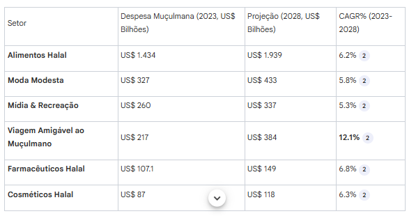 Os alimentos halal são o maior segmento, com consumo de US$ 1,43 trilhão em 2023, projetado para alcançar US$ 1,939 trilhão até 2028.